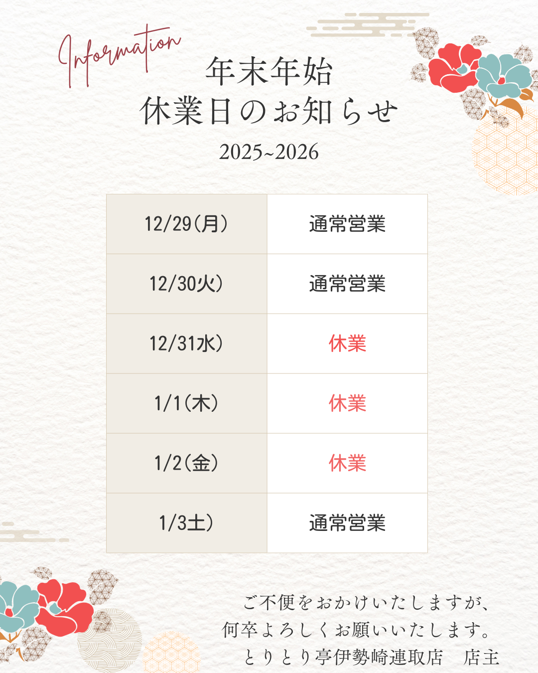2025.12.10 年末年始の営業について 年末年始の営業について年内30日まで営業します。年始は3日から営業します。営業時間につきましては、通常通りとなります。よろしくお願いします。 ≫ PDFを開く